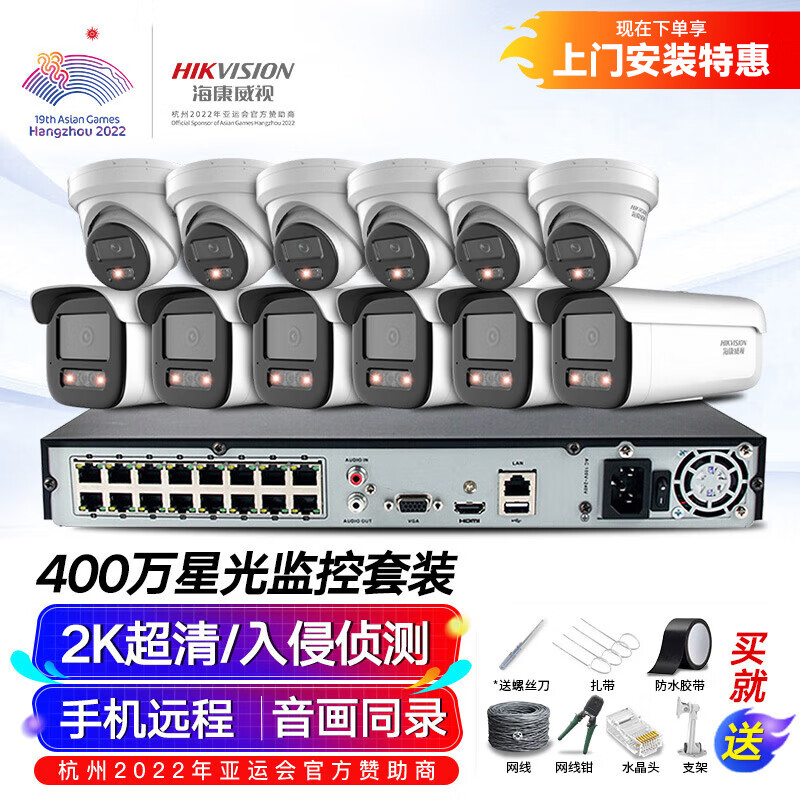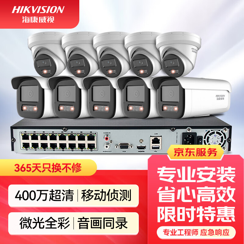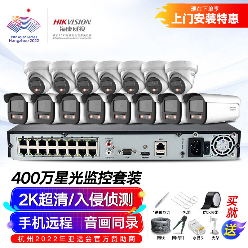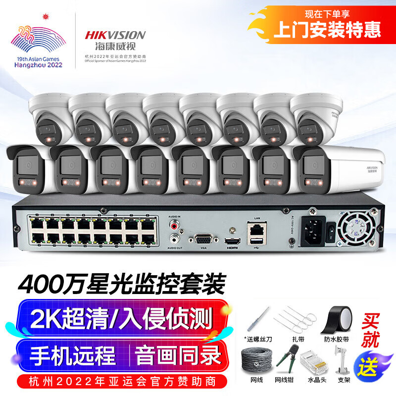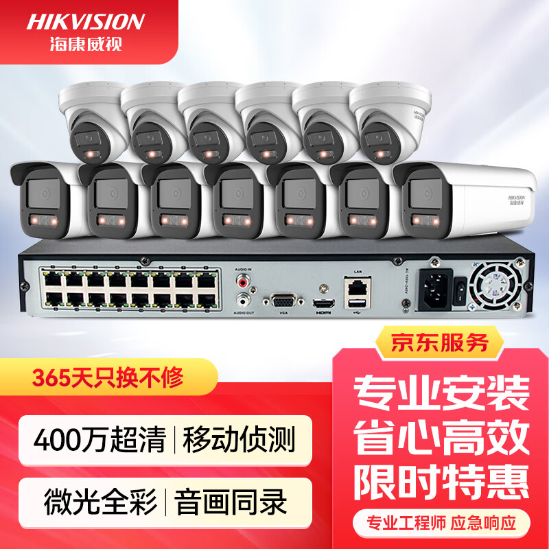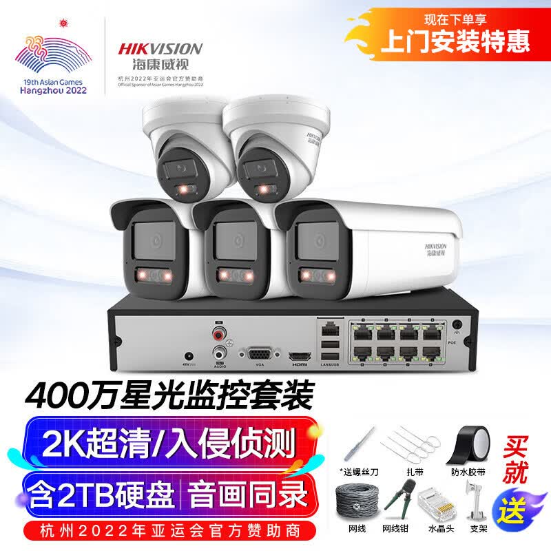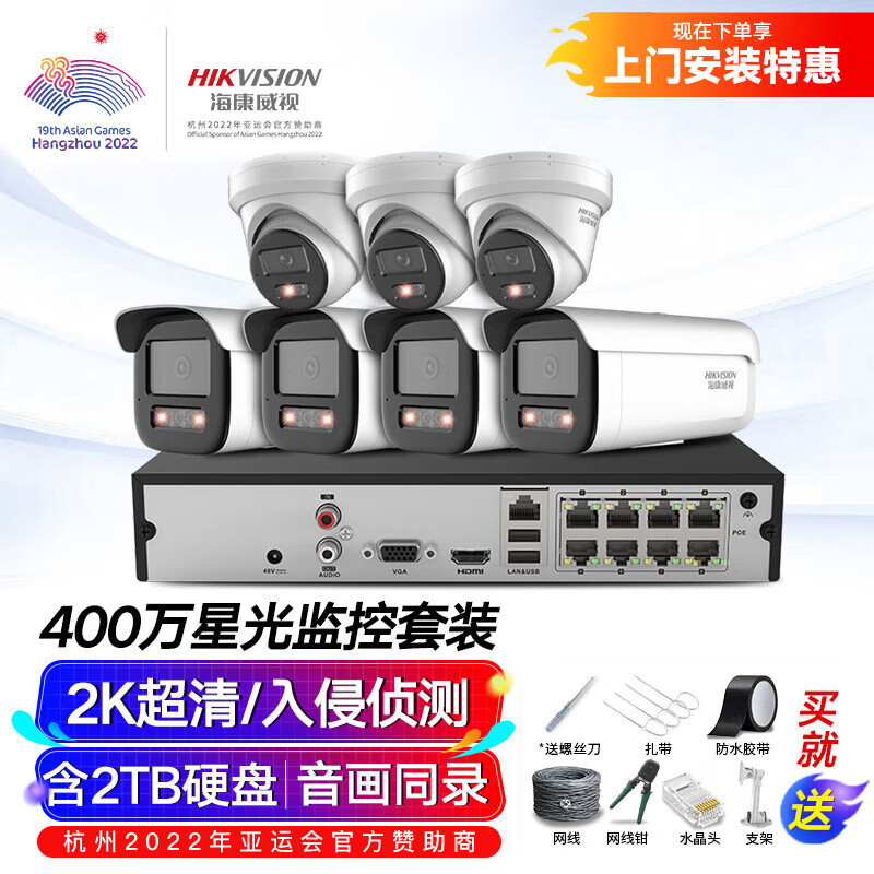 HIKVISION海康威视监控套装摄像头解决方案400万星光夜视2K高清拾音室外防尘防水poe网线供电4路2T硬盘3T46