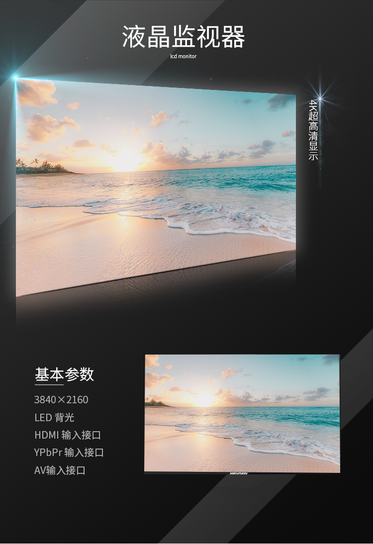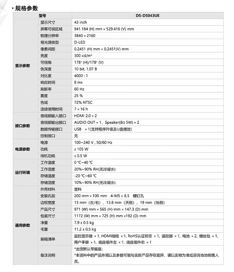 海康威视 43英寸4K超清抗干扰监视器宽频监控液晶显示器D5043UE(D5043UQ-A代替款)