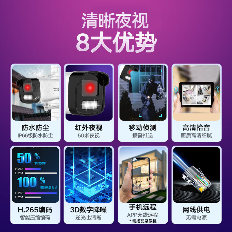 HIKVISION海康威视监控摄像头200万poe供电AI人形侦测可录音红外夜视50米家用室外监控器B12HV3-IA 4MM